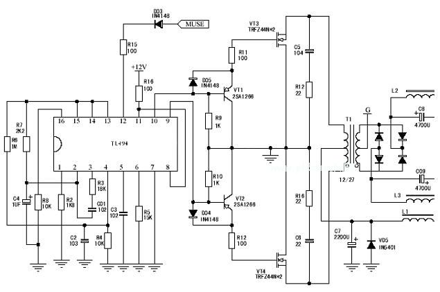 Jensen功率变换器,则采用传统开关电源它激式驱动器驱动四只MOS FET开关管组成的并联推挽电路,其功放变换器电路如附图所示。该汽车功放中利用MOS FET管作为开关管,可以提高电源变压器的工作效率,有利于抑制脉冲干扰,同时还可以减小电源变压器的体积。变换器的振荡器和控制系统全部集成在IC (TL494)内部。TL494原设计为它激式开关电源驱动控制器,内部除含有振荡器,脉宽调制器以外,还有基准电压稳压电路,死区时间控制电路和两组比较器组成的误差检测电路。TL494在该电路中构成它激式变换器,只利用了其振荡器和驱动电路,用作驱动开关管的脉冲信号源,因而与常规用法有所不用。在该电路中,TL494第5,6脚外接时间常数电路(C3,R5),振荡器产生80kHZ的脉冲信号,经TL494内部双稳态触发器控制,变成两路时序不同的驱动脉冲,驱动两组驱动放大器。TL494内部两组驱动级,由第9,10脚输出时序不同的正向脉冲。为了避免在两路脉冲交替处推挽开关管VT3,VT5 和VT2,VT4同时导通,TL494的第四脚外接R6,C2,R4设定死区时间。一组驱动脉冲使推挽电路一臂导通后,相隔一死区时间,才发出另一组驱动脉冲,使另一臂导通(第四脚电压越高,死区时间越长)。TL494第1,2脚为两组取样放大器的同相和反相输入端,可控制内部比较器组成的脉宽调制器设定的占空比。在该变换器中,TL494各脚功能及应用如下: