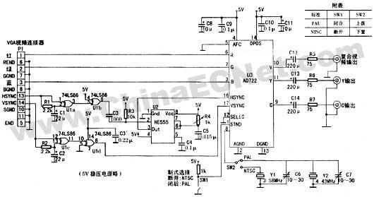 该电路以模拟集成电路AD722为基础,AD722是可将RGB信号转换为NTSC/PAL信号的编码器,产生与PAL或NTSC标准一致的、对应的亮度(基带振幅)和彩色信号(调幅和调相),还可将亮度和彩色信号混合生成混合视频输出,所有输出可直接驱动标准75Ω端口的视频电缆,无需额外的放大器,该器件只需一组+5V电源,而且无需外部延迟线或滤波器。