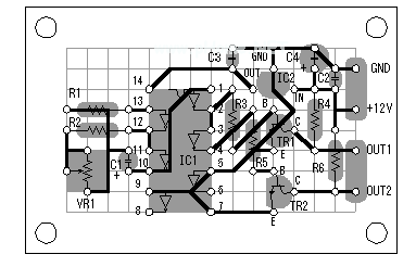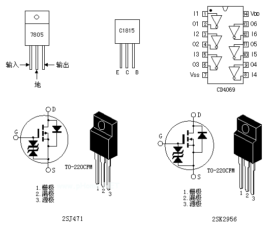 电路板见图11。所用元器件可参考图12。逆变器用的变压器采用次级为12V、电流为10A、初级电压为220V的成品电源变压器。P沟道MOS场效应管(2SJ471)最大漏极电流为30A,在场效应管导通时,漏-源极间电阻为25毫欧。此时如果通过10A电流时会有2.5W的功率消耗。N沟道MOS场效应管(2SK2956)最大漏极电流为50A,场效应管导通时,漏-源极间电阻为7毫欧,此时如果通过10A电流时消耗的功率为0.7W。由此我们也可知在同样的工作电流情况下,2SJ471的发热量约为2SK2956的4倍。所以在考虑散热器时应注意这点。图13展示本文介绍的逆变器场效应管在散热器(100mm×100mm×17mm)上的位置分布和接法。尽管场效应管工作于开关状态时发热量不会很大,出于安全考虑这里选用的散热器稍偏大。