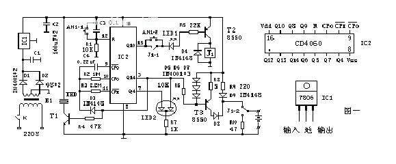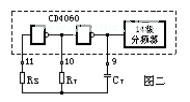 工作原理如图一所示。它是以CD4060为核心的控制器。CD4060是14位二进制串行计数/分频和振荡器。它由两部分构成:一部分电路是14级分频器,其分频系数为16~16384(由Q4~Q14输出)。另一部分电路是振荡器,可由外接电阻和电容构成RC振荡器。f=1/2.2RT CT。见图二。本装置由C4、R2、R3 组成频率约为0.2Hz的振荡器。