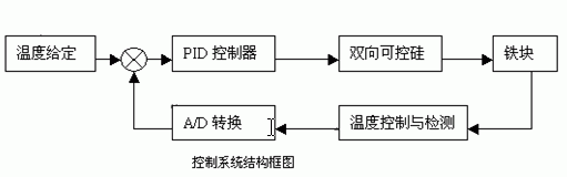 本温度控制和显示系统是一个闭环反馈控制系统,它用温度传感器将检测到的温度信号经放大,A/D转换后送入计算机中,与设定值进行比较,得到偏差。对此偏差按PID算法进行修正,返回对应工况下的可控硅导通时间,调节电热丝的有效加热功率,从而实现对铁块的温度控制。