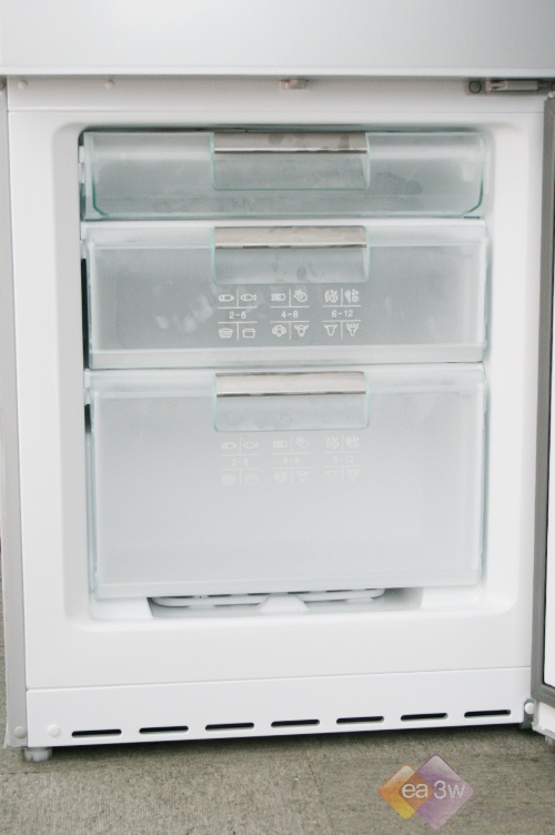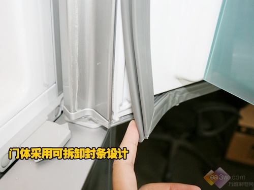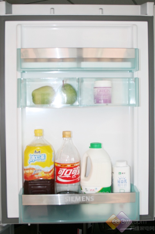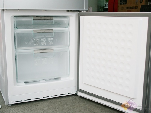 冷藏室门体,分成三个部分,大小不一的搁架可分别存放各种体积不同的物品。唯一美中不足的是,门体的搁架不能随意移动,有些不方便。
