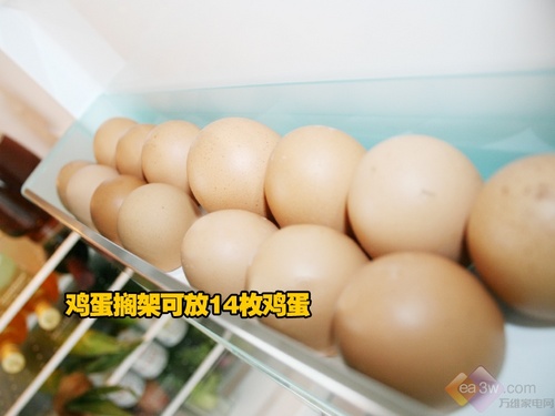 上层搁架配有鸡蛋托盘,可存放14枚鸡蛋,足够三口之家的日常使用需要。还可将鸡蛋托盘撤掉,摆放一些对保存温度要求不高的酸奶、饮料等物品。.