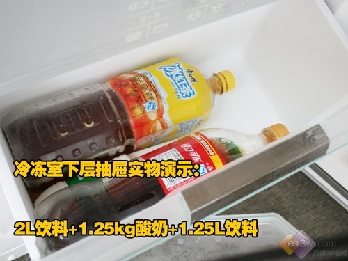 将一瓶2.0L的饮料、1.25kg的酸奶和1.25L的饮料放入冷冻室下层抽屉,内部还可放置其它物品,空间足够大。