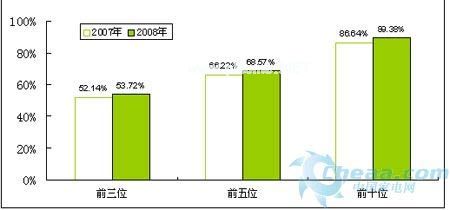 出口市场遇阻、外部环境的压力也加剧了2008年冰箱内销市场的竞争,品牌集中度进一步提高,据国家信息中心和中国家电网联合发布的《2008年读国内重点城市冰箱市场零售监测分析报告》的收据显示,2008年冰箱内销份额前三、前五、前十位品牌的销量占有率分别提高了1.58、2.35、2.74个百分点。