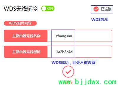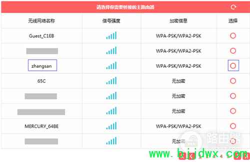 | 1、在浏览器中输入melogin.cn——>在跳转页面中输入“登录密码”,登录到MW316R路由器的设置界面。 2、点击“高级设置”,打开水星MW316R路由器的“高级设置”选项。 3、点击“无线设置”——>“WDS无线桥接”,打开MW316R路由器的“WDS无线桥接”选项。 4、设置MW316R路由器桥接无线信号 (1)扫描无线信号,点击“下一步” (2)、此时水星MW316R路由器会自动扫描附近的无线信号,请在结果中找到主路由器的无线信号(本例中是:zhangsan),然后点击“选择”。 (3)、输入主路由器的无线密码,点击“下一步”。 (4)、设置MW316R的无线参数,设置“无线名称”、“无线密码”——>点击“下一步”。 5、修改水星MW316R的LAN口IP地址 (1)、在“新的LAN口IP地址”后面,填写新的IP地址——>然后点击“下一步”。 修改原则: 如果主路由器的IP地址是:192.168.1.1;则MW316R的LAN口IP地址,修改为:192.168.1.252 如果主路由器的IP地址是:192.168.0.1;则MW316R的LAN口IP地址,修改为:192.168.0.252 如果主路由器的IP地址是:192.168.2.1;则MW316R的LAN口IP地址,修改为:192.168.2.252 重要说明: 修改MW316R的LAN口IP地址后,需要在浏览器中输入修改后的IP地址,才能重新打开MW316R的设置界面。本例中需要输入192.168.1.252,才能重新登录到水星MW316R的设置界面了。 (2)、点击“完成”。 6、检查无线桥接设置是否成功,在“WDS无线桥接”选项处,查看WDS的状态,如果显示:已连接,如下图所示。说明水星MW316R V2.0路由器无线桥接设置成功。 7、关闭DHCP服务器,点击“网络参数”——>“DHCP服务器”,然后点击关闭。 |