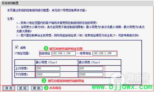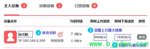 | 目前水星MW300R无线路由器,有V3、V4、V6、V9、V10、V11、V12、V15这么多版本,其中V3-V9版本的水星MW300R路由器,限制网速(分配宽带)设置方法一致。而V10-V15版本的水星MW300R路由器,限制网速(分配宽带)设置方法一致。版本号可以在路由器底部的标签中查看到,标签上Ver:后面的就是版本号。 一、V3-V9版本MW300R限速设置 1、划分宽带资源 在对V3-V9版本的MW300R路由器进行限速设置之前,请先弄清楚你的宽带大小?并对宽带资源进行合理大划分,下面进行距离说明:用户线路为4M ADSL线路(上行带宽512Kbps,下行带宽4096Kbps),需要保证台式机游戏、视频,其他终端可以正常浏览网页、QQ等应用。结合用户需求与总带宽,分配规则如下: 2、为台式机设置固定IP 根据第1步中的需求,台式电脑需要单独设置一个宽带值,所以这里需要给台式机设置一个固定IP地址(本例中将其设置为:192.168.1.10),后续在设置限速的时候,会用到。而其它设备的宽带资源大小都是一样的,所以IP地址就不用设置为固定值了。 3、设置限速 ①启用宽带控制 点击“IP宽带控制”——>勾选“开启IP宽带可能工作”选项——>设置“宽带线路”、“上行总宽带”、“下行总宽带”——>点击“保存”。 ②设置台式机限速 点击“增加新的条目”,按照图中指导添加控制台式机带宽的规则——>设置完成点击“保存”。 ③设置其它设备限速 点击“增加新的条目”——>“起始地址”和“结束地址”分别填写:192.168.1.100 和 192.168.1.199——>上行最小带宽为:200,最大带宽为:500——>设置下行带宽最小为:2500,最大带宽为:3500——>设置完成点击“保存”。 二、V10-V15版本MW300R限速设置 1、找到被限速的设备 在V10-V15版本MW300R路由器的设置页面,点击“常用设置”——>“连接设备管理”——>“主人设备”,然后找到需要被限速的设备。 2、设置限速 点击被限速设备后面的修改按钮,然后设置“限制上传速度”、“限制下载速度”即可。 |