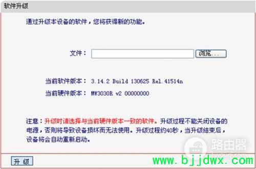 | 1、查看版本号,水星系列的无线路由器,其版本号可以在路由器底部的标签中查看到,标签上 Ver:后面的就是版本号。 2、下载升级软件,请点击下面的链接,去水星路由器的官网,下载升级软件:http://service.mercurycom.com.cn/download-search.html?kw=MW300R,如果下载回来的升级软件是一个压缩包,需要进行解压的。 3、进行固件升级 1)V3-V9版本MW300R固件升级 ①登录到设置页面,在浏览器中输入192.168.1.1并按回车键——>在“用户名”中输入:admin,“密码中”输入:admin——>点击“确定”。 ②软件升级,点击“系统工具”——>“软件升级”——>点击“浏览”选项,找到电脑中的升级文件——>然后点击“升级”。 2)V10-V15版本MW300R固件升级 ①登录到设置页面,在浏览器中输入melogin.cn——>输入“登录密码”,登录到MW300R路由器的设置界面。 ②软件升级,点击“高级设置”——>“设备管理”——>“软件升级”——>点击“浏览”,找到刚才下载的升级软件——>点击“软件升级”。 |