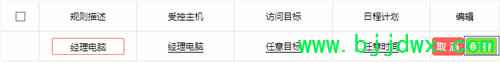 | 1、登录路由器管理界面,点击 高级设置 >> 上网控制 >> 行为管理,进入设置界面。 2、添加新规则,在设置界面点击 添加,添加经理电脑的访问权限。点击受控主机栏的 配置,如下图: 3、添加受控主机,受控主机可以是主机的MAC地址或IP地址,此处添加经理电脑的MAC地址,如下图: 4、添加访问目标,访问目标即可以访问的网站地址,您可以结合实际需要填写访问目标,本例中经理可以访问 任意目标,点击 使用,如下图: 5、添加日程计划,经理可以在任意时间访问任意网站,所以选择 任意时间,如下图: 6、保存设置,添加经理电脑规则完成后,点击 保存,如下图: 从以上规则可以看出,我们可以针对某台电脑的MAC地址设置某个时间段允许/禁止访问特定的目标,请结合您的实际需要进行设置。 与添加经理上网规则类似,点击 添加,设置员工访问规则。本例中通过员工的IP地址段(所有电脑)控制上网规则。如下图: 7、添加员工主机,您可以通过IP地址来限制某台电脑的权限,此处使用IP地址段限制所有员工,如下: 注意:此处IP地址段虽然包含经理的IP地址,但经理的规则在前,所以不冲突。 8、添加访问目标,添加员工在非工作时间可以访问的目标,本例中员工可以访问任意目标,如下图: 9、添加非工作时间段,添加员工的非工作时间段,如下: 10、保存配置。配置完成后规则如下: 11、过滤规则选择 仅允许规则列表中的上网行为(表中的规则允许,其他不符合规则的均不允许通过),启用行为管理。 至此,上网控制规则设置完成,经理电脑上网不受限制,员工电脑在工作时间无法上网。 |