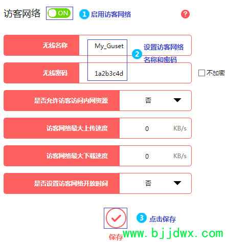 | 1、清空浏览器的地址栏,输入管理地址melogin.cn,如下图: 2、输入路由器的管理密码,进入管理界面。 路由器没有默认管理员密码,密码是初次设置路由器时设置好的,如忘记密码,必须复位路由器。 3、进入管理界面,点击界面左侧的 无线设置,如下图: 4、在此处修改 无线名称,建议使用数字、字母的组合,请勿使用中文或特殊字符。设置一个至少8位以上的 无线密码,点击 保存,即设置完成。无线终端可以连接修改后的无线网络。 注意:路由器默认的无线加密类型为WPA-PSK/WPA2-PSK,加密算法为AES。 您也可以点击页面右上角的 高级设置, 再点击 无线设置 >> 主人网络 ,修改无线参数。 5、路由器支持访客网络,如您需要开启此功能,请点击页面右上角的 高级设置,点击 无线设置 >> 访客网络,开启访客网络功能,设置访客网络名称和密码,点击 保存,如下图。 至此,无线信号名称和密码设置完成,所有需要上网的无线终端,请连接修改后的信号上网。 温馨提示:如果您仅修改了无线密码而没有修改无线名称,那么已经连接过该无线信号的终端无法自动连接上信号,必须删除终端上保存的无线配置文件,重新连接。 |