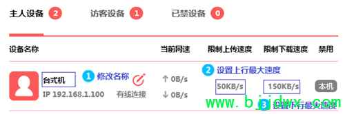 摘要: 1、登录路由器管理界面,点击 常用设置 >> 连接设备管理 >> 主人设备,找到台式机的相关条目(可以通过终端设备的IP地址确定),如下图:2、设置台式机网速,点击,修改终端名称为常用名 ...