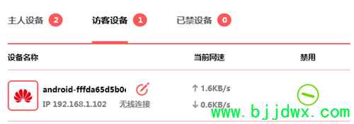 5、连接访客网络的所有无线终端共享上面设置的上下行最大速度,各访客设备的实时速率可以在 常用设置 >> 连接设备管理 >> 访客设备 查看,如下图: