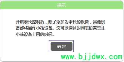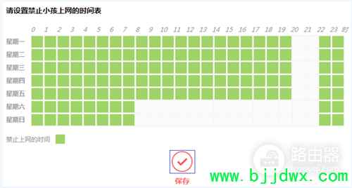 | 1、登录路由器管理界面,点击 高级设置 >> 上网控制 >> 家长控制,进入设置界面。 2、添加家长电脑,点击 添加,如下图: 3、在添加栏中选择家长电脑的MAC地址,点击 保存。如果有多台电脑要作为家长电脑,请逐一添加,如下图: 4、添加完成后,家长主机的列表如下图,该列表的主机的上网不受限制。 5、添加允许小孩上网的时间段,空白区域为允许上网的时间。如下图: 注意:本例中允许小孩在周内20:00~22:00、周末08:00~22:00上网,具体根据实际需求。 6、在页面上方点击开启家长控制,如下图: 7、在弹出的提示框中,点击 确定,如下图: 至此,家长控制功能设置完成。家长上网不受任何限制,小孩只能在指定时间上网。 |
