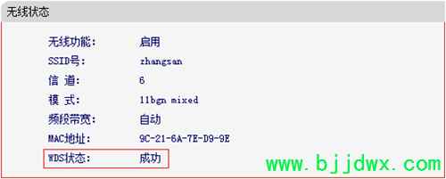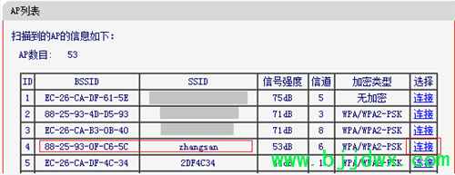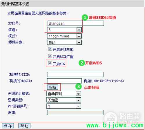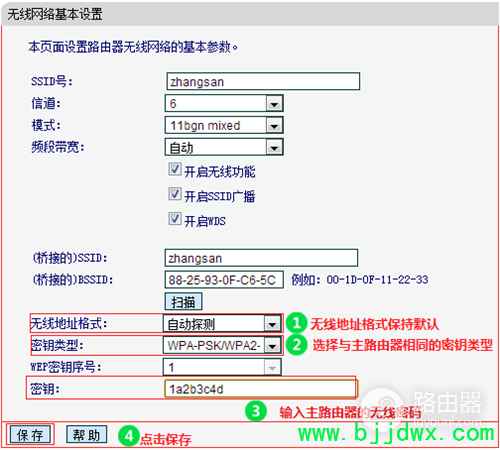 | 1、确认主路由器的无线信号名称、无线密码以及无线信道,本文使用以下参数举例: 注意:无线桥接(WDS)的主要操作均在副路由器完成,只需固定主路由器的无线信道。 2、电脑连接副路由器,登录路由器的管理界面,点击 网络参数 >> LAN口设置,修改 IP地址(如主路由器的IP地址是192.168.1.1,则副路由器修改为192.168.1.2),保存 并重启路由器。 注意:重启后使用修改后的IP地址登录副路由器的管理界面。 3、使用修改后的IP地址登录路由器管理界面,点击 无线设置 >> 无线基本设置,设置与主路由器相同的 SSID 号及 信道,勾选 开启WDS,点击 扫描。 注意:如果不需要实现无线漫游,可以将本路由器的无线名称及密码设置为与主路由器不一样。 4、在扫描到的AP列表中找到主路由器的无线信号,点击 连接,如下图: 5、选择与主路由器相同的 密钥类型,在 密钥 位置输入主路由器的无线密码,点击 保存。 6、点击 无线设置 >> 无线安全设置,选中 WPA-PSK/WPA2-PSK AES,PSK密码 处填写和主路由器相同的无线密码,点击页面下方的 保存。 7、在路由器的管理界面,点击 运行状态,观察 无线状态 >> WDS状态,显示 成功 则表示桥接WDS设置成功。 8、点击 DHCP服务器 >> DHCP服务设置,DHCP服务器 选择 不启用,点击 保存。 至此,无线桥接设置完成。无线终端连接zhangsan,有线电脑连接主、副路由器的LAN口即可上网。终端移动过程中,可以实现主、副路由器间的自动漫游。 |