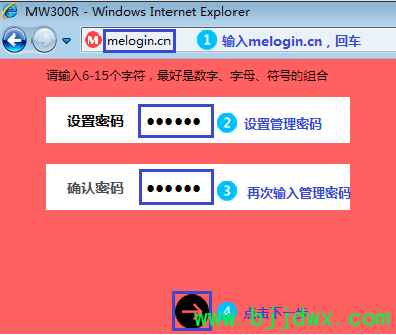 2、打开浏览器,清空地址栏并输入路由器的管理地址melogin.cn,在弹出的设置管理密码界面中,设置6~15位的管理密码,点击 下一步,登录路由器管理界面。