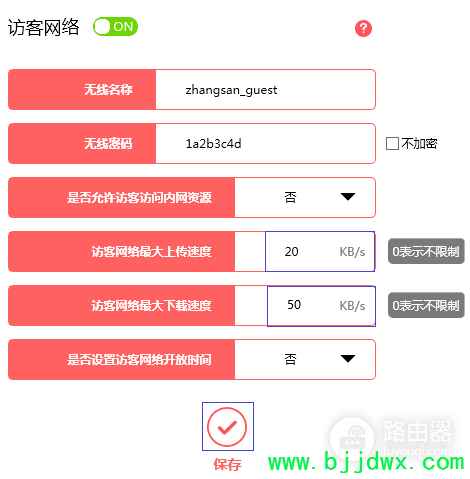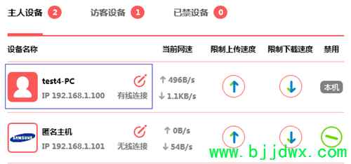 | 1、登录路由器管理界面,点击 常用设置 >> 连接设备管理 >> 主人设备,找到台式机的相关条目(可以通过终端设备的IP地址确定),如下图: 2、设置台式机网速,点击,修改终端名称为常用名,便于管理。然后点击↑和↓,分别设置上下行速度的最大值。 注意:限速是针对设备的MAC地址,设备无需固定IP地址,设备更改IP地址不会导致限速不生效。 3、使用相同的方法,限制手机的上下行速度,如下图: 4、在管理界面点击 高级设置 >> 无线设置 >> 访客网络,分别设置访客网络的上下行最大速度,点击 保存。如下图: 5、连接访客网络的所有无线终端共享上面设置的上下行最大速度,各访客设备的实时速率可以在 常用设置 >> 连接设备管理 >> 访客设备 查看,如下图: 至此,网速限制设置完成。 |