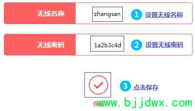 4、在此处修改 无线名称,建议使用数字、字母的组合,请勿使用中文或特殊字符。设置一个至少8位以上的 无线密码,点击 保存,即设置完成。无线终端可以连接修改后的无线网络。