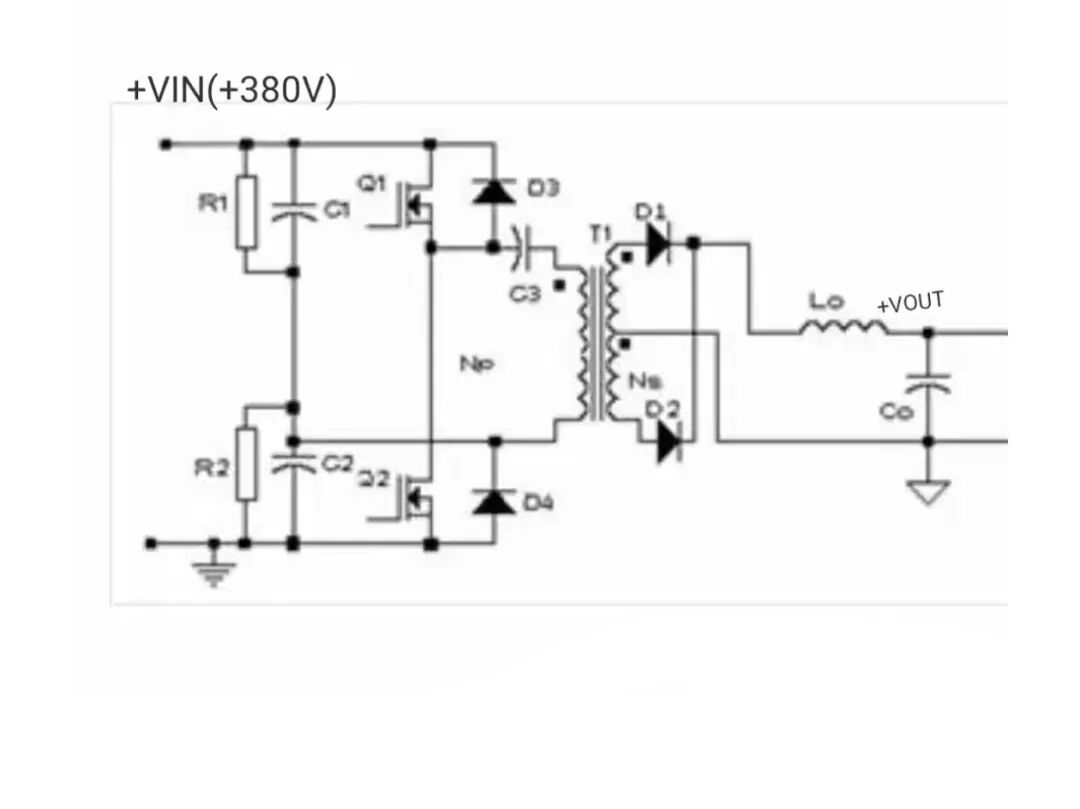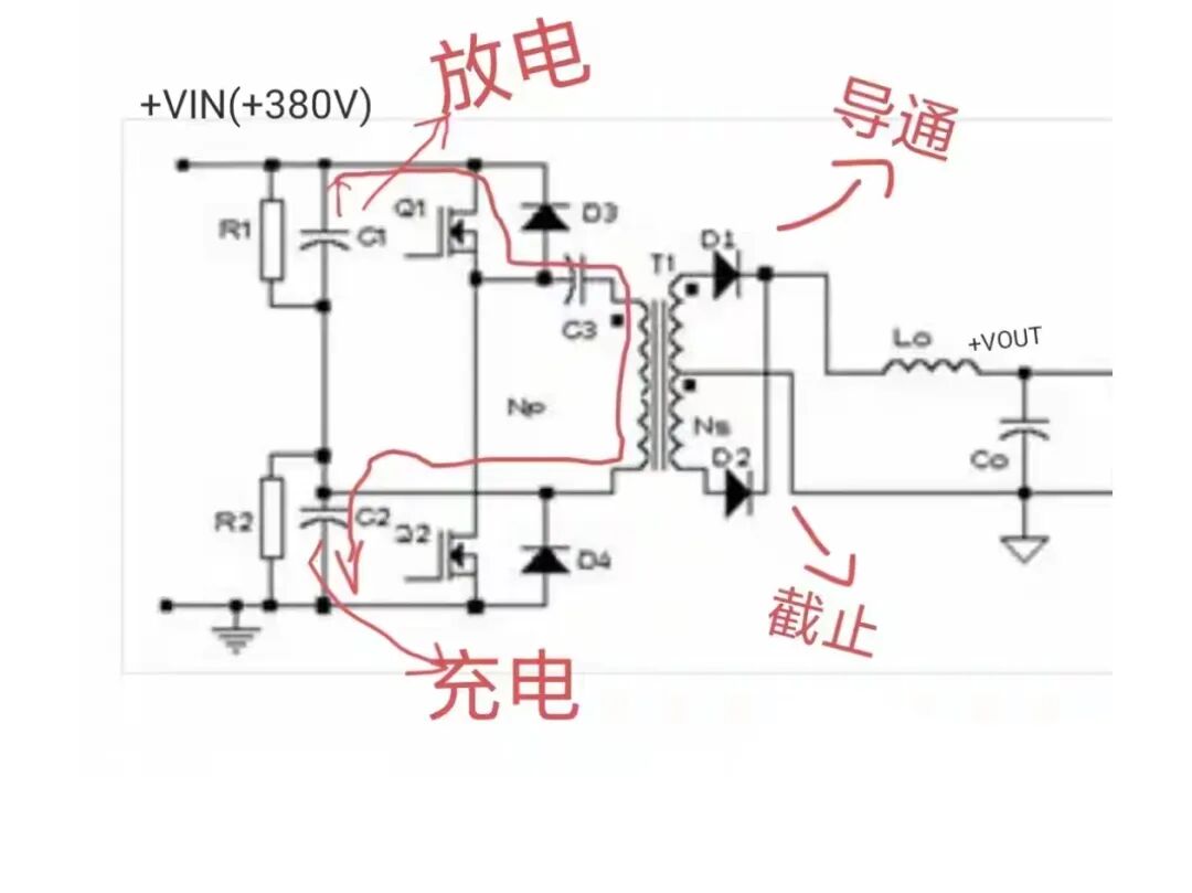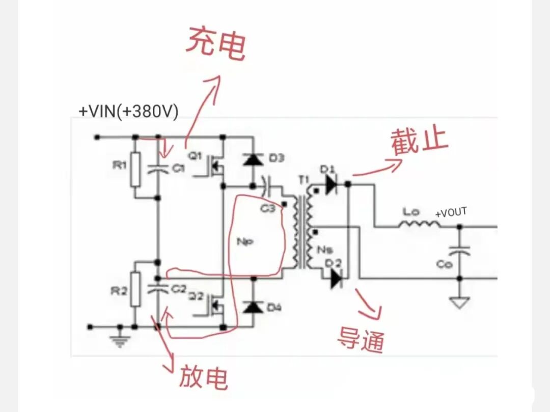 一、什么是半桥开关电源? 半桥开关电源是一种非常常见的中、大功率开关电源拓扑结构。 它的核心特征是由两个串联的功率开关管Q1、Q2(通常是MOSFET) 和一个中点 构成,其形状类似于一个“桥”,但由于只用了桥臂的一半(两个开关管)来进行开关控制,所以被称为“半桥”。 如图示 主要特点: ①适用功率范围: 通常用于几百瓦到一千多瓦的场合。 ②结构较复杂: 介于正激(简单,功率小)和全桥(复杂,功率大)之间,是一种性价比较高的方案。 ③抗不平衡能力: 具有天生的抗变压器磁偏磁能力,这是它相对于单端拓扑(如正激式)的一个巨大优势。 ④主要构成元件: 两个开关管Q1、Q2,两个分压电容C1、C2、一个正激高频变压器T1、整流二极管D1、D2,储能电感Lo滤波电容Co等构成。 注意:电路中还串入了C3,起什么作用呢? 二、半桥开关电源的工作原理 为了更好地理解,我们将其工作过程分解为几个关键部分。 ①电路的起始状态与分压 直流输入电压(如PFC级输出的+380V直流)加在由开关管Q1、Q2和电容C1、C2串联构成的桥臂上。 电容C1和C2的容量相等,它们通过电阻R1、R2或其他方式被预充至大约一半的输入电压,即 `Vc1 = Vc2 ≈ Vin/2`。 这两个电容不仅用于滤波,更重要的是与开关管配合,在变压器初级产生交流电压。 二、下面,我们结合图示的电流路径,详细分析一个完整的工作周期: ①第一阶段 控制电路(电源管理芯片完成)驱动Q1导通,Q2截止。 此时C1放电,C2充电。 电流路径:C1放电→Q1→ C3→变压器T的初级绕组 → 电容C2→最终回到输入负端。 如图示 初级电压:此时,加在变压器初级绕组上的电压为 `C1上的电压,所以初级绕组NP上的电压 `VNP = VC1 ≈ Vin/2`(方向为上正下负)。 次级输出:变压器次级绕组NS感应出电压,根据同名端关系,此时二极管D1正向偏置而导通,D2反向截止。能量通过D1传递到负载。 ②第二与第四阶段:死区时间1和2 在Q1关断后、Q2开启前,进入死区时间1,以及Q2关断后、Q1开启前,进入死区时间2。 目的:防止Q1和Q2同时导通,造成“直通”短路,烧毁开关管。这是半桥电路控制的关键。 电流路径:在此期间,变压器初级绕组的励磁电感会维持原先电流方向,该电流会通过开关管的体二极管或外部的并联RC缓冲电路进行续流,为下一次开关动作做准备。 ③ 第三阶段 死区时间1后,控制电路驱动Q2导通,Q1截止。 此时C2开始放电,而C1开始充电。 电流路径: 电流从C2的正端(即中点)流出→经过 变压器T的初级绕组→ Q2→ 地(输入负端)。注意,这里实际上是C2在放电。 如图示 初级绕组电压:此时,加在变压器初级绕组NP上的电压是电容C2两端的电压,即 `VNp= -VC2 ≈ -Vin/2`(方向为下正上负)。与第一阶段相比,电压方向相反。 此时电源+VlN(+380V)给C1充电。 同时次级感应输出:变压器次级绕组NS感应出的电压方向也随之改变。此时二极管D2正向偏置而导通,D1反向截止。能量通过D2传递到负载。 ④循环与输出 通过Q1和Q2交替导通(相位相差180度),在变压器初级产生了一个幅值约为 `±Vin/2` 的交流方波电压。这个交流电压被变压器耦合到次级,经过次级的高频整流器(通常为中心抽头全波整流或全桥整流)和LC滤波电路后,就得到了平稳的直流输出电压。 输出电压反馈:输出的直流电压通过反馈网络(如光耦)传送到控制芯片(如UC3825, SG3525等),控制芯片通过调节两个开关管的占空比来稳定输出电压。当负载变重时,增加占空比;负载变轻时,减小占空比。 三、半桥电路的优缺点总结 优点: 不需要退磁电路,自动抗磁偏 由于变压器初级施加的是对称的交变电压,磁芯在正负半周都能被利用,工作在B-H回线的第一和第三象限,避免了磁芯饱和的问题。 缺点: ①变压器初级电压利用率低: 施加在变压器初级的电压只有输入电压的一半(`Vin/2`)。要获得相同的输出功率,初级需要比全桥电路更大的电流。 ②需要平衡电容: 电容C1和C2的分压需要保持平衡,但在现实中由于两个开关管Q1、Q2参数会多少有偏差,因此会造成C1、C2分压不平衡,所以电路串入平衡电容C3,通过C3的充放电作用,维持中点电压平衡,同时达到自动消除偏磁的目的。 每天分享电子知识,仅供参考,多谢支持! |