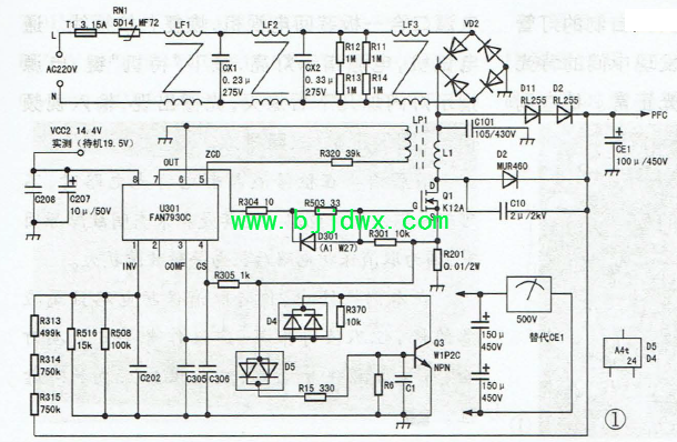 TCL C32E320B液晶彩电PFC电压偏高故障检修 一台TCL C32E320B型渡晶电视,顾客称:在收看中机内"啪"的一声响,机内冒出浓烟,但仍有图像和声音,急忙拔出电源插头,见机内有液体流出。 拆机检查,发现PFC电路滤波电容CE1(100UF/450V)已经开裂流产电解液。拆下CE1,用无水酒精清洗干净电路板,在路检查其他元件,未见异常。实绘出该机PFC电路如图1所示。 为安全起见,用两只150μF/450V的电容串联后代替CE1,并且并联一只500V直流电压表。通电试机,看到电压表指针已摆到500V位置,随后又逐渐下降到350V左PFC右。按"开机"键后,PFC电压在450V-470V之间波动,但次级输出的12V及3.3V电压正常,屏上出现TCL图标,亮度不稳定。该机PFC电压大幅偏高,重点检查PFC芯片U301(FAN7930C)外围阻容元件,未发现问题,更换U301后试机,PFC稳定为380V,故障排除。 |