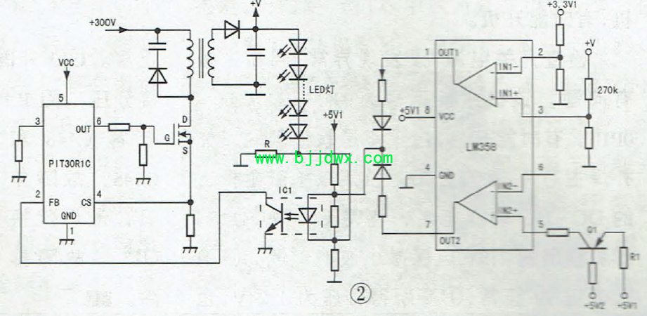 AOC LED4322S液晶黑屏故障检修 接修一台2017年4月出厂的AOC LED4322S型液晶彩电,开机后指示灯反应正常,但背光不亮。 拆机,测三合一板上副电源输出的+12V、+5V1及+3.3V1均正常。二次开机后,测+5V2、+3.3V2正常,但LED灯供电+V快速升到150V,随后快速降为OV,判断背光驱动电路进入了过压保护状态。根据经验,此故障原因多为屏内灯条开路所致。拆屏后发现,该机采用四根灯条串联,每根灯条上有9只灯珠,总共36只灯珠,如图1所示。 用指针万用表RX10k挡逐个检测,发现一只灯珠开路,一只明显衰减。将这两只灯珠短路(减少两个灯珠对亮度及输出电压影响不大)后试机,故障排除。 本故障应是由于灯珠开路,导致背光驱动板高压保护所致。现结合实绘电路(见图2)简述LED背光驱动原理:二次开机后,副电源初级产生的VCC电压(20V左右)加到PIT30R1C⑤脚(vccl,其⑥脚输出驱动信号,推动场效应功率管工作于开关状态,次级输出+V电压,供给LED灯串。PIT30R1C④脚检测开关管电流,②脚(反馈端)检测LED灯串电流,以改变⑤脚输出脉冲的占空比,从而改变输出电压,保持LED灯串电流的恒定。②脚电压过高或过低均将导致电源保护。 LM358及外围电路组成保护电路见图2,其内部两个运放接成两个电压比较器。比较器1监测+V电压,②脚(反相输入端)接基准电压,当+V过高时,则取样后的电压使③脚(同相输入端)电压高于②脚,①脚输出高电平5V,光耦IC1饱和导遇,PIT30R1C②脚电压接近OV,电源进入过压保护状态。LM358⑥脚(反相端)接入基准电压,当+5V2失压或过载导致该电压大幅下降时,Q1导遇,+5Vl电压通过Q1加到LM358③脚,此时⑤脚的电压高于⑥脚,则⑦脚输出高电平,光耦饱和导通,电源进入保护状态。 在检修中实测R1阻值超过2Mn,明显不正常,因为如此大阻值的电阻会使LM358⑤脚一直为低电平,失去+SV2的欠压保护功能。笔者用一只51Ω/8W电阻代换R1,在+5V2欠压时,测得LM358①脚电压约为3V,高于⑥脚电压,从而使⑦脚能输出保护高电平。 |
