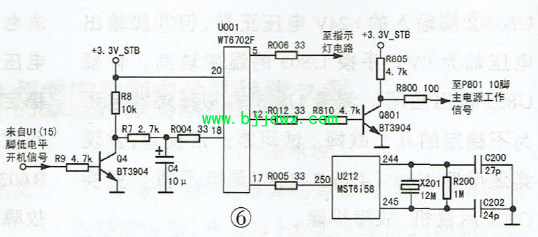 一台L40V10FBEG型液晶彩电,不开机,指示灯由红色变为绿色后又变为红色。 分析检修:本机芯彩电的开机过程如下:接通电源开关后待机电源工作,输出+3.3V_STB待机电压,为按键板上的单片机U1(MSP430F2111)及电源管理芯片U001(WT6702F)等电路供电。接下"开/待机"键后,U1的15脚输出低电平开机信号,经控制电路使U001的18脚为高电平,如图6所示。 这时,U001⑤脚输出高电平,待机指示灯由红色变为绿色;U001的⑩脚输出低电平→Q801截止→插座P801⑩脚为高电平→开关电源中的主电源工作→P801①~④脚有+24V电压输出,U212得电工作;U001的17脚输出低电平送至U212的250脚,则U212的220脚输出高电平背光灯点亮信号ON_PBACK、219脚输出高电平显示屏供电信号ON_PANEL,231脚输出初始亮度信号ADJ_PWM2,背光亮,屏上出现"TCL王牌"字符,至此开机过程结束。若上述开机过程因故受阻,则在U212控制下使U001⑤、12、17脚输出与上述相反的电平,主电源停止工作,红色待机指示灯重新点亮。 从上述分析可知,本机指示灯能短时变为绿色,表明U001、U1工作基本正常。接通电源开关,按一下"开/待机"键后,能短时检测到P801①~④脚有+24V电压输出,由此确认U001,U1工作正常。强制启动主电源后,测U212的供电、时钟及复位电压,发现U212的244、245脚没有时钟振荡波形,代换晶振X201后试机,故障排除。 |