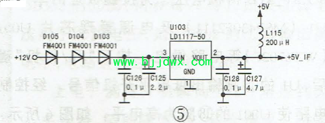 一台L37V10FBE型液晶彩电,开机五六分钟后自动关机。 分析检修:在故障出现时,测量电源板输出的3.3V_STB、+24V电压均正常,主板上DC-DC电路输出的+12V、+3.3V、+1.8V及+1.26V电压也正常,但+5V电压仅为+3.8V。+12V电压先经D103~D105降压,再由U103(LD1117-50)稳压为+5V,如图5所示。手摸U103并没有明显温升,测量U103的③脚输入电压只有+5V(正常时约为+10V),明显偏低。检查输入电压电路,发现降压二极管D103(FM4001)热机后正向电阻变大,其两端压降达5V之多。更换D103后试机,故障排除。 |
