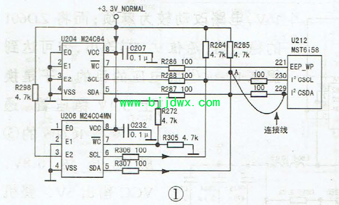 一台L40C10FBE型液晶彩电,不定时死机(没有图像和声音)。 分析检修:该型彩电不定时死机的原因一是电源板不良,如板上的接插件接触不良,电源控制芯片或周边元件热稳定性差;二是主板存在隐性故障,如主芯片U212(MST6i58)不良,直流电源变换IC不良,或印制板铜箔(含过孔)或无件焊点出现隐性裂上电测量主板上的+3.3V、+24V电压均正常,为U212内核供电的直流变换块U210(LD1117)输出的+1.8V电压正常,U212的3.3V供电也正常。接下来测量U212总线电压,发现E2pROM存储器U204(M24C64)送往U212总线端口229脚(I2CSDA)数据线的电压为2.8V,而与之相邻的230脚(I2CSCL)时钟线电压却为正常的3.3V。检查U212的229脚外围电路,如图1所示,发现R285下端"A"点至U212的229脚阻值竟达3kΩ,明显异常,判断此段铜结存在隐性断裂点。用一根导线跨接A与U212的229脚后试机,故障排除。 |