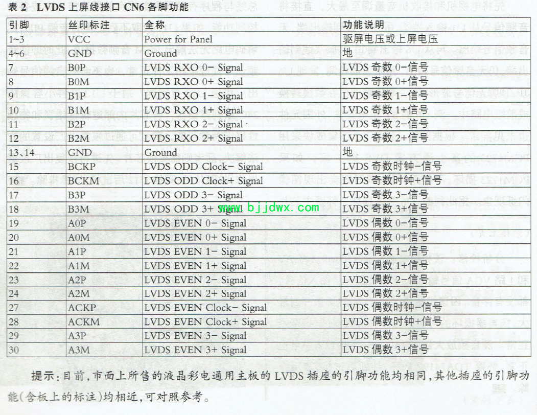 智能液晶彩电MSD338STV5.0 型通用主板换板操作图解(中) 3. 背光驱动板连接插座CNl 该板左下侧红色插座CNl 为背光驱动板连接插座,①、②脚为背光驱动板的+12V 供电( 多为22 英寸及其以下的小屏幕),假如背光灯驱动板采用其他电压供电,则不接这两脚; ③脚(BK) 接背光驱动板的开/关控制端, 高电平有效; ④脚(ADJ)接背光驱动板的亮度调节端, ⑤、⑥脚接背光驱动板的接地点。 4.上屏线接口CN6 CN6 为LVDS 上屏线接口,靠近标有白色小三角形的插针为①脚,如图6 所示。①脚所在排从左向右的脚位依次为1 、3 、5 、7 ……, ①脚对面一排从左向右的脚位依次为2 、4 、6 、8 ……,其引脚功能见表2。 提示:目前, 市面上所售的液晶彩电通用主板的LVDS 插庄的引脚功能均相同,其他插座的引脚功能(含板上的标注) 均相近,可对照参考。 三、软件升级操作 该主板的软件升级无需专用的烧写(或升级)工具,用普通的U 盘即可完成软件升级,非常方便。该通用主板所用的绝大部分升级程序是按屏分辨率分类的,也就是说只要屏的分辨率相同,其驱动程序(升级数据)也基本相同。若配用的液晶屏的分辨率为1920X1080 , 贝IJ先找到该分辨率的升级数据压缩包,然后解压,得到messi,bin 文件(二进制数据格式文件),如图7 所示,最后将bin 格式文件拷贝到U 盘根目录下(注意:拷贝时不能将升级文件放到U 盘某文件夹中,也不能更改升级文件的名称) 。 图7 接下来在主板的CN5 插座中接上按键、遥控接收头与红、绿指示灯(若无按键,可只接遥控接收头与红、绿指示灯),然后将装有升级文件的U盘插到主板的任意一个USB 接口中,最后按住"EN" 键不松手(或将CN5 中的EN 端对地短接),并接通1 2V 电源,这时红色指示灯亮, 几秒后红、绿指示灯交替闪烁,屏上出现升级进度条,如图8 所示,此时可松开"EN"键(或断开EN 端对地的短接线)。 提示: ( 1 )若主板已升过级,但原升级程序对应的分辨率与实际所配液晶屏的分辨率相差过大,再次软件升级时,屏上可能元任何显示(黑屏或白屏) ,但红、绿指示灯会交替问烁。 ( 2 )在软往升级过程中,不能拔下U 盘,也不能断开主板的供电。否则,会导致主板软件系统损坏,无法再用U盘升级。 约两分钟后指示灯停止闪烁,升级进度显示"100%" ,随后绿灯熄灭、红灯亮, 主板自动进入待机状态,这说明软件升级成功,此时需断开12V 供电,并拔下U盘(否则,主板会自动开机并重复升级) 。接下来再上电二次开机, 观察开机画面及图像是否正常。 |