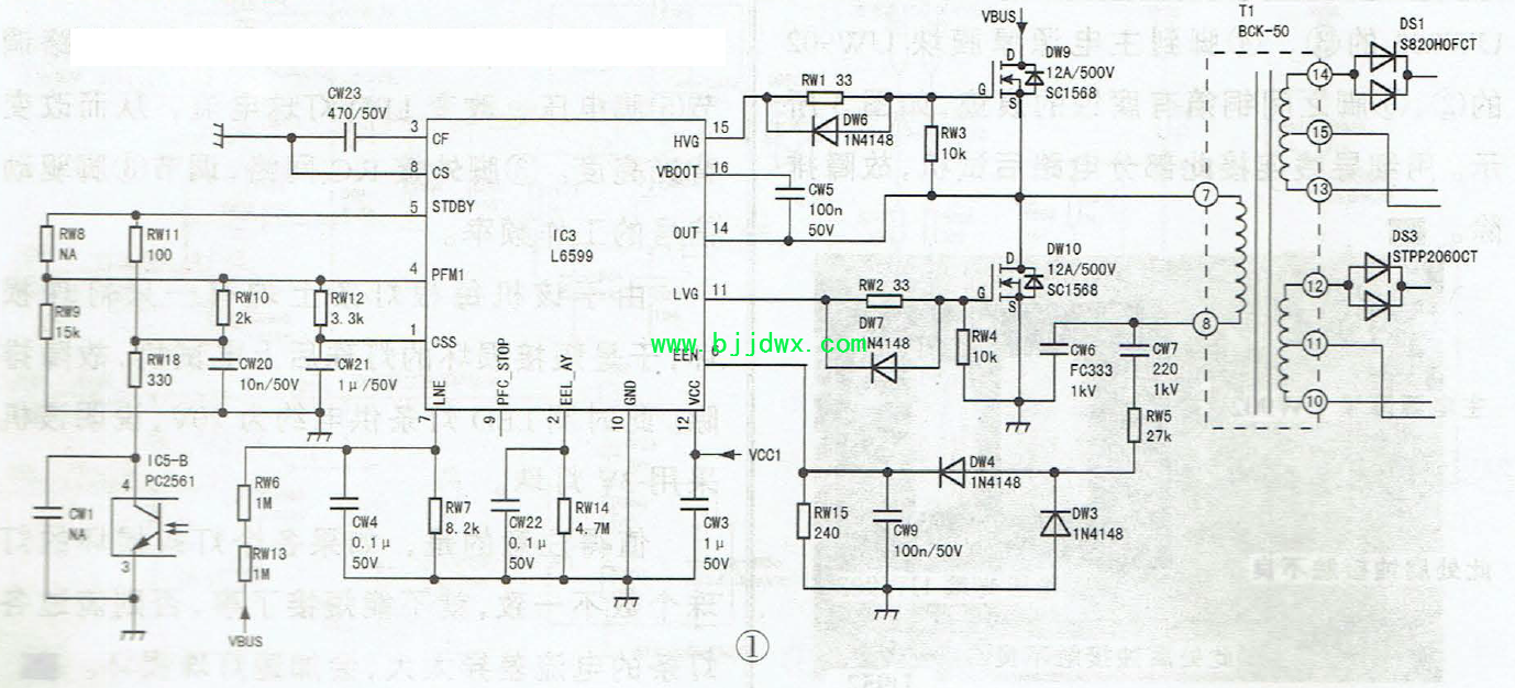 TCL LCD32K73型液晶电视不开视故障检修 一台TCL LCD32K73型液晶电视,二次开机后红灯变绿灯,但屏不亮。 拆机检测,+24V无输出,并且电源次级多只电解电容已鼓包。拆下电源板,将鼓包电解电容全部换新,+24V依旧无输出。测+24V及+12V负载无短路,整流管阻值也正常。测PFC电压为300V,表明PFC、PWM电路没有工作。该电源板型号为40-OPL37CPWC1XG,其PFC芯片采用L6563,PWM芯片采用L65990由于L6599有欠压保护功能,当PFC电压过低时,L6599⑦脚(输入电压检测)电压偏低,PWM电路停止输出,因此先查PFC电路。 凭经验PFC电路中的大阻值电阻容易变值,于是重点检测L6563外围几只大阻值贴片电阻,发现阻值都有不同程度变小,用碳膜电阻代换这几只电阻后上电,PFC电压正常,但仍无+24V输出。 测IC3(L6599)⑦脚电压已在正常范围内,但11、15脚无输出。在线测IC3各脚对地阻值,发现①脚对地阻值仅几百欧姆。IC3的外围电路如图1所示,IC3①脚对地阻值应该比较大。检查IC3⑤脚外围电路,发现电容CW20漏电。用一只103涤纶电容代换后试机(见图2),+12V及+24V输出正常,电源板上机,图声正常,故障排除。 提示:L6599的③脚(STDBY)是待机控制端,当该脚电压高于1.25V时,芯片启动;电压低于1.25V时,芯片进入待机状态。电容CW20漏电后,⑤脚电压低于1.25V,芯片进入待机状态。 |