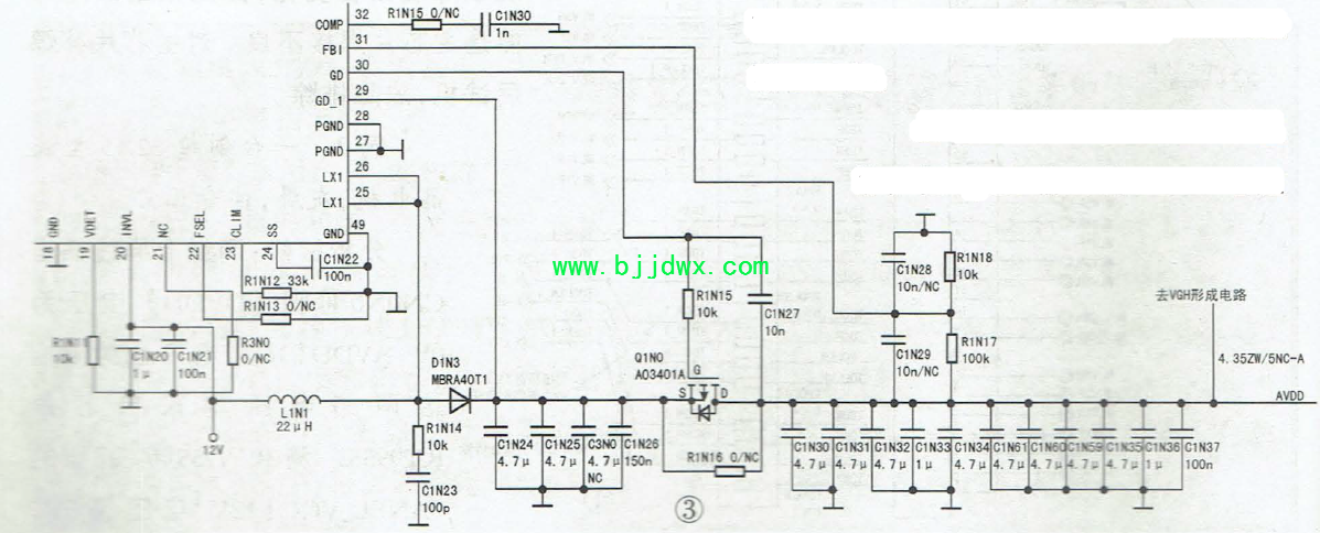 一台创维32X5型液晶电视,白屏、伴音正常。 分析检修:根据故障现象分析,该机故障部位在TCON板或主板与TCON相关的电路中。测试上屏线插座CNONO中的DVDD、AVDD电压为0V,正常时分别为3.3V和16V;LVDS各通道电压在1.0V-1.3V之间变化,说明主芯片中的LVDS信号处理电路正 常。DVDD、AVDD电压由主板电源管理芯片RT9955(U1N0)提供,测RT9955的16、17、20、25、26脚有正常的12V供电,9脚(EN)使能电压为正常值4V(12V经RIN6、RIN7分压得到)。根据维修经验判定,该机故障可能是AVDD电压异常,导致整个电源管理块停止工作。AVDD电压是电源管理块首先产生的一路电压,送入TCON电路板,同时形成VGH电压(31V),如图3所示。25、26脚输出开关驱动脉冲,经L1Nl储能变换、D1N3整流、C1N24、C1N25等滤波,30脚输出启动AVDD的开关信号,Q1N0导通,在D极得到16V(AVDD)电压。此电压再经分压电阻R1N17、R1N18分压返回到IC31脚,实现稳压控制。 检查AVDD电压形成电路,发现Q1N0开路。更换Q1N0后试机,故障排除。 |