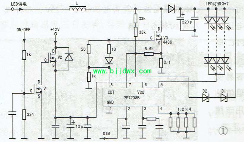 一台飞利浦32PHF3655/T3型液晶彩电,黑屏,伴音正常。 一台飞利浦32PHF3655/T3型液晶彩电,黑屏,伴音正常。 拆机检查,发现该机为AOC代工产品,怀疑该机LED灯珠有问题,因刚修了一台32英寸的AOC液晶彩电(还不到一年的新机器),故障原因是两颗灯珠坏。 测LED灯条供电,在二次开机后升到25V就开始下降,应该是过压保护,判断屏内灯条有问题。拆屏,发现灯珠跟上次修理的AOC机的一样,屏内共有三根并联的灯条,每根灯条由7只灯珠串联。用指针表R×10k挡逐个检测,发现每根灯条上都有一颗灯珠不亮。 实绘该机LED灯条驱动电路,如图1所示。二次开机后,ON信号为高电平,场效应管V1、V2相继导通,+12V送到PF7708B的⑥脚(VCC端),⑧脚输出推动信号,推动场效应管V3工作于开关状态。V3导通时,电感L储能;V3截止时,电感L的感应电压与LED供电叠加,供给LED灯条。 ⑦脚为保护端口。当V3过流时,⑦脚电压高过保护闭值,过流保护。当输出电压过高时,稳压管D1、D2击穿,⑦脚电压升高,过压保护。④脚为LED灯条电流监测脚,LED灯条电流通过⑤脚内部电路到④脚,再经4只并联的1.2Ω电阻到地。芯片根据④脚①电压调节⑧脚输出驱动信号的占空比,从而调节输出电压以稳定灯条电流。②脚为调光DIM端口,通过内部电路调节⑤脚电压,改变LED灯珠电流,从而改变背光亮度。③脚外接RC网络,调节⑧脚驱动信号的工作频率。 由于该机每根灯条上均有一只灯珠损坏,于是短接损坏的灯珠后上电试机,故障排除。此时测LED灯条供电约为20V,说明该机采用3V灯珠。 值得注意的是,假如各个灯条损坏的灯珠个数不一致,就不能短接了事,否则流过各灯条的电流差异太大,会加速灯珠损坏。 |