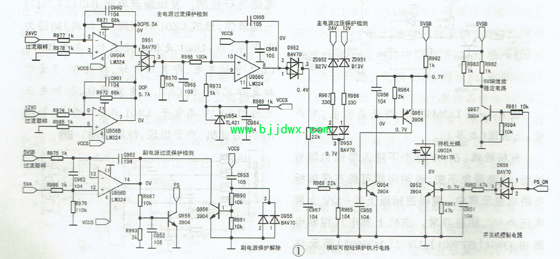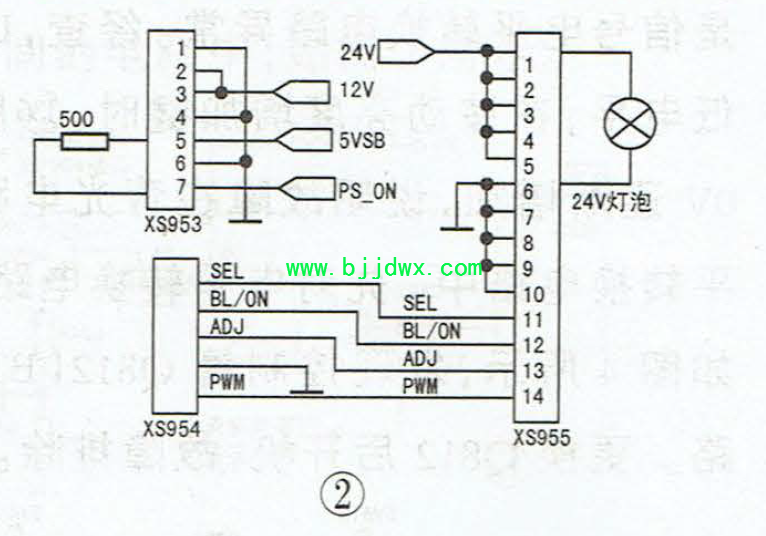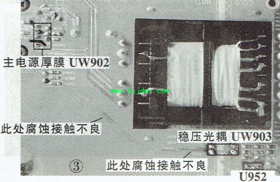 康佳LED42US92DC型液晶彩电开机之后黑屏没有声音的维修 该机在按下电源开关通电后,红色指示灯亮,数秒钟后变为绿色指示灯亮,但无图像、无伴音,黑屏幕。 根据故障现象,指示灯由红色变为绿色,说明副电源正常,主板控制系统正常,电视机已经进入开机模式,故障原因一是主电源工作失常,二是主板电路有故障。 拆机检测,+5V待机电压正常,+24V电压快速升到+26V,然后又慢慢降为9.5V;+12V电压在开机瞬间上升到+8V左右,然后降为3.7V。估计该故障系保护电路动作所致。 该机设有以模拟晶闸管Q951、Q954为核心的过流、过压保护电路,如图1所示。当发生过流或过压故障时,Q954的b极变为高电平,Q954、Q951导通,光耦U902因①脚电压过低而截止,开关电源进入待机状态。 上电测得Q954的b极电压为0.7V,由此判断保护电路已启动。在开机的瞬间测得过压保护隔离二极管D953的正极电压约为0.5V,然后降为0V,由此判断过压保护电路已启动。 断开电源板上的+24V和+12V电压输出插座XS953、XS955的排线,在XS953的⑤、⑦脚之间接一只500Ω电阻,以强制开机;在XS955的24V输出端①、⑥脚之间接一只24V摩托车灯泡做假负载,如图2所示。 接下来将Q954的b极对地短接,手按住电源开关为电源板通电,发现+24V电压快速升到30V、迅速断电。根据经验,稳压电路中的误差放大器和光耦易损坏。检查这部分电路,发现光耦UW903的③、④脚到主电源厚膜块UW902的②、⑥脚之间铜箔有腐蚀的痕迹,如图3所示。用细导线连接此部分电路后试机,故障排除。 |