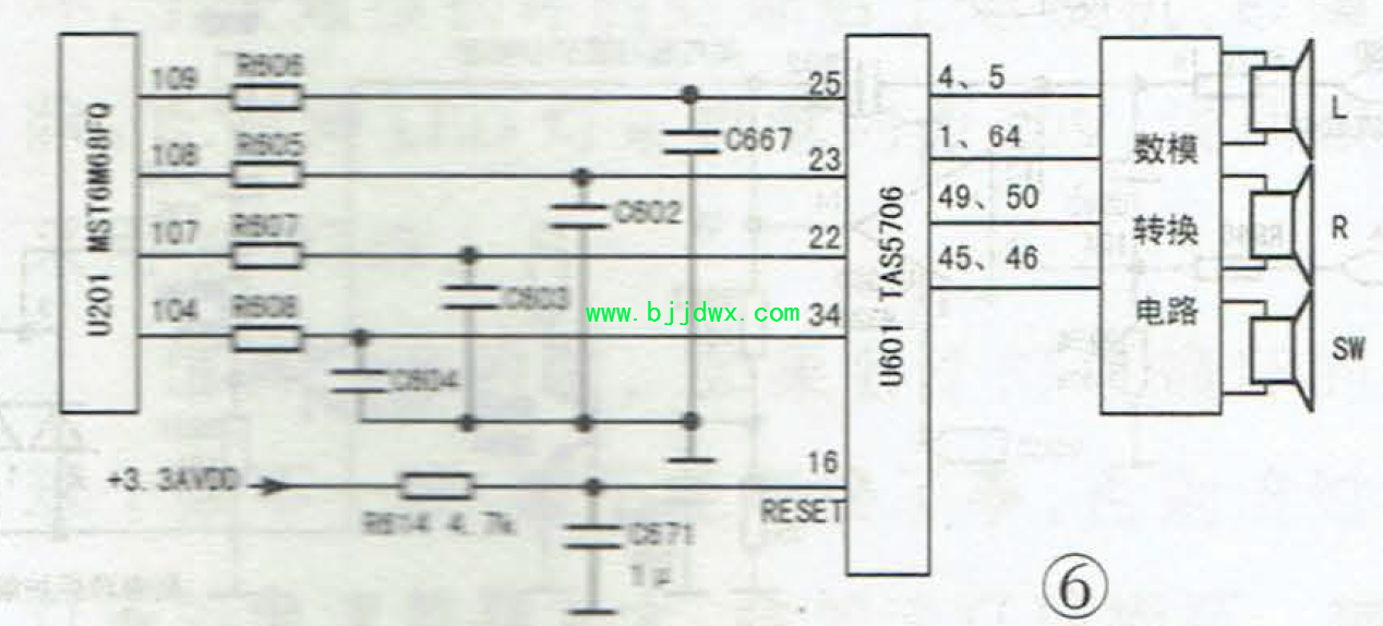 TCL L46F19BD型液晶彩电图像正常没有伴音的维修 分析检修:为了判定故障范围,在AV状态下注入影碟机信号,用示波器观察功放块U601(TAS5706)的信号输入端25、23、22、34脚波形,发现波形正常,而输出端④、①、49、45脚却没有信号波形。测U601的+24V及+3.3V供电均正常,且28、29脚总线电压(约3V)、21脚静音电压(低电平静音,实测为+2.8V)也正常,怀疑U601已损坏。考虑到该数字功放块有复位端,如图6所示。是否因复位电路有问题使U601不能正常工作呢?接下来对这部分电路进行检测,发现限流电阻R614(4.7kΩ)一端虚焊,造成U601的16脚(复位端)始终为低电平(注:U601是低电平复位,在开机时,C671开始充电,即复位开始,经过30多毫秒后复位完毕,在C671充电完毕后,16脚电压变为约+3.1V高电平,U601正常工作)。补焊R614后试机,声音出现,故障排除。 |