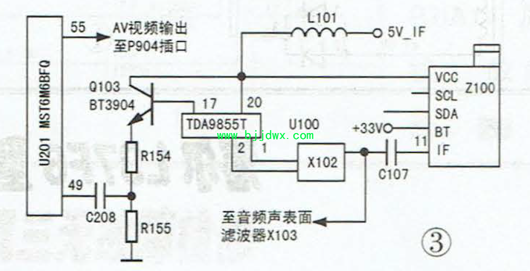 一台42E9FBD型液晶彩电为什么TV状态无图像。 分析检修:由于只是TV状态下无图像,因此故障应该在高频头或中放电路中。从高频头信号输出端11脚注入信号,屏上没有杂波反映;再在主芯片U201的49脚注入信号,屏上有杂波反映,据此表明故障在高频头11脚至U201的49脚之间的电路中,如图3所示。 从U100(TDA9855T)视频信号输出端17脚注入信号,屏上没有杂波反映,显然故障在Q103或其偏置电路中。焊下Q103检测,发现b-e结已开路。更换Q103后试机,故障消失。 |