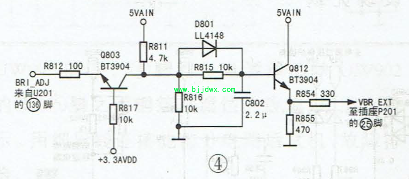 一台L42P10BD型液晶彩电,黑屏(伴音正常)。 分析检修:观察背光灯管未亮。分析认为:故障原因一是背光电路异常,二是U20190、136脚未发出屏幕点亮及亮度控制信号,三是信号电平转换电路异常。经查,U201的90脚为低电平;在按动亮度增加键时,136脚电压能从0V逐渐增加,说明故障在背光电路或信号电平转换电路中。先对电平转换电路进行检查,如图4所示,发现控制管Q812(BT3904)已开路。更换Q812后开机,故障排除。 |