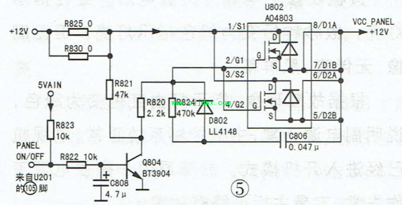 一台L42M9HBD型液晶彩电,有声音,无图像(灰屏)。 分析检修:在AV状态下注入影碟机信号试机,故障现象不变,表明问题可能在逻辑板电路或显示屏中。测得逻辑板上的+12V上屏电压为0V,明显异常。该机上屏电压控制电路由Q804(BT3904)、U802(A04803)等元件组成,如图5所示。查U802输入端①、③脚的+12V输入电压正常。短路Q804的c、e极,U802输出端⑤~⑧脚电压仍为0V,说明U802已开路损坏。换用性能相近的A04801L后试机,逻辑板上的+12V电压已经正常,故障修复。 |