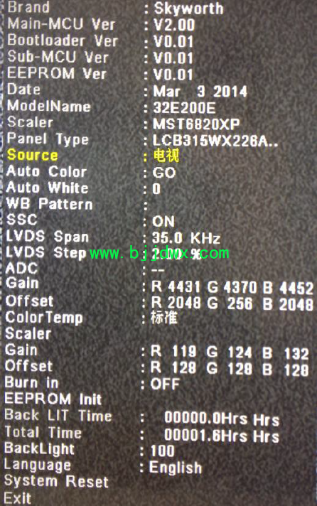 创维32E100E液晶彩电工厂模式调整 此机种需要做Auto Color和白平衡调整。 Auto Color调整如下: 1. 进入工厂模式(以相似机种为例) 按“菜单+1999+->回看(返回)”或者“菜单+1999+OK”。 2. ADC调整方法 本站家电维修网https://www.bjjdwx.com/是以家电维修技术交流为中心的技术论坛:进入工厂模式。 第二步:用遥控选择“Current Source”。 第三步:设置Timing和Source模式。 第四步:选择“Auto Color”。 3. 设置Timing和Source模式 请做VGA和YPbPr 的Auto white100%。 Timing和模式选择:YPbPr: Timing 311; pattern 185 YPbPr: Timing 314;pattern 185 VGA: Timing 137; pattern 42 白平衡调整如下: 1. 进工厂模式; 2. 此机种只调整Ypbpr source,以NORMAL为例; 3. 用遥控选择“Current Source”来选择Ypbpr,Color temp选择NORMAL; 4. 调整R,G,B GAIN值,是色温,亮度达到规格;(Ypbpr TIM 314;PAT 141(80IRE)) 5. 色温规格如下: |
