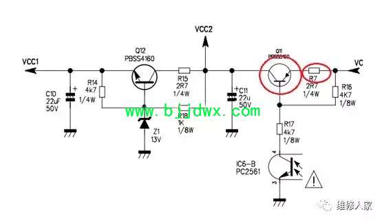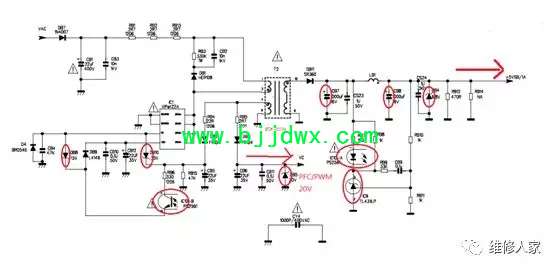 液晶电视的电源板在整机上故障率是相当高的,也是我们修理液晶电视的重点和难点之一,容易给人以迷惑。他的相当一部分能量供给灯板驱动电路(根据发光源不同分为高压板和LED灯板两类)和主板上,一旦电视出现不开机、黑屏、纹波干扰、不定时关机等现象时,我们往往搞不清楚故障是出在电源板、主板、灯管(条)还是灯驱动板上,给维修造成很多弯路。 下面以TCL-PWL37C电源电路电路图纸为例,简单介绍一下液晶电视电源的工作原理(修过CRT彩电电源的师傅应该都知道,液晶电视的电源跟CRT大部分地方都是差不多的,仅仅多了个PFC电路而已)。 1:待机电路。 接通电源后,电源输出插座P3的③、④脚就应有+5V电压输出,给主板CPU电路供电。另外,在热地一侧,副开关电源变压器T2的④-⑤绕组还会输出一组 电压,整流滤波后输出+20V,供给主电源的PFC振荡电路和PWM振荡电路。(见图2) 假如输出电压不稳定,则检查以IC9(TL431)为中心组成的稳压控制电路。正常工作时,TL431的①脚电压为2.5V,假如该脚电压异常,则说明 TL431损坏或其外围元件有问题。 故障现象1:无+5V电压输出。 分析检修:检查待机电源电路,发现IC1的⑤-⑧脚电压为0V,经查限流电阻RB 13端头焊接部分已脱焊。建议将RB1、RB2、RB13这3只限流电阻换成功率为1W或2W的同阻值电阻,以免再次损坏。 故障现象2:+5V电压在3V左右波动。 分析检修:空载试机,+5V电压仍较低,这说明故障在待机电源部分。检测输出电压电路中的稳压二极管DB4(6.8V)和DB5 (20V ),发现DB5击穿,换新后故障排除。 另外,该电路中稳压二极管DB5(20V)、DB10(33V)、DB8(10V )易损坏,其故障现象多表现为+5V电压在+4V左右波动。 故障现象3: +5V输出电压只有+4V。 分析检修:空载试机,+5V电压仍较低,这说明故障在待机电源部分。直观检查发现+5V滤波电容CB7、CB8已鼓包,换新后故障排除。 2.开/待机控制电路 开机时,电源板上插座P2的①脚(PS-ON)收到从主板送来的高电平开机信号,通过DS9、RS16加到三极管QS3 (BT3904,可用C1815代换)的b极,如图4所示,这时QS3导通,5V电压通过RS 15后流过光耦IC6的①、②脚,此时IC6的③、④脚内部的光敏三极管导通,随即Q11导通,这时待机电源输出的约20V的VC电压,通过Q11给 PFC电路提供+19V左右的工作电压(VCC2),再通过Q12稳压后给PWM电路提供+12V左右的工作电压(VCC1)。(见图3)待机时,PS-ON信号为低电平,QS3因b极为低电平而截止,光耦IC6不导通,Q11、Q12均截止,PFC和PWM电路因失电而停止工作。 故障现象:+5V电压正常,但无+12V和+24V电压输出。 分析检修:测+5V待机电压正常,用导线将+5V电压接到开/待机控制端,测电容C5两端电压只有+300V,这说明PFC电路没工作;测PFC振荡块 IC2(L6563)的供电端14脚电压为0V(正常值是++19V),该电压由变压器T2的④-⑤绕组产生。检查该供电电路,发现三极管Q11击穿,电 阻R7开路。更换损坏元件后试机,故障排除。 液晶电视PFC电路维修 3.PFC电路 集成块IC2 (L6563)与开关管QF5、QF6 (SK3568,可用K2645代换)等元件组成的PFC电路,如图5所示。当IC2的14脚得到19V左右的供电后,IC2开始工作,从13脚输出脉冲 信号,由QF3、QF4组成的推挽电路交替工作于导通与截止状态,功率管QF5和QF6工作于开关状态。 当QF5或QF6导通后,整流后的市电对储能电感L1进行充电,电能转化成磁能储存在L1中;当PFC的驱动信号是低电平时,QF5、QF6因G极为低 电平而截止,此时L1中储存的磁能释放,经D2整流、C5滤波后与VAC电压叠加,输出370V~410V的电压VBUS。 L6563的主要引脚功能:①、②脚为稳压取样控制端,若这两脚外接元件损坏,则输出的PFC电压或过高或过低;④脚外接一只电阻来检测流过开关管的电 流,在内部电路的作用下,以控制开关管的导通时间,假如④脚电压大于1.7V、 IC将关断;⑦脚为PFC输出电压的检测端,外接取样电阻,正常时该脚电压在0.26V~2.5V之间,若超出这一范围,IC将会关断;⑩脚通过电阻分压 对+300V电压进行检测,当输人市电电压过低,致使该脚电压低于0.52V时,IC关断,以实现输人欠电压保护功能。 故障现象1:开机烧保险。 分析检修:检查发现开关管QF5击穿,但换新后又再次损坏,对该部分电路中的其他易损件QF6、QF3、QF4、C5等进行检查,发现C5容量变小,换新后故障排除。 故障现象2:开机后,光栅闪烁。 分析检修:开机后测得电源板输出的+12V和+24V电压均不稳定,并测得C5两端电压仅为300V、说明PFC电路未工作。 检查IC2的14脚供电正常。断电后在路测量IC2的各脚阻值,发现①脚对地阻值很小,检查其外围元件,发现电容CF7漏电,换新后故障排除。 故障现象3:更换PFC电路部分元件后,PFC电压高达500V。 分析检修:该电源板原是保险管熔断,开关管QF5、QF6击穿,将这些损坏元件更换后开机,测得C5两端电压高达500V,立即关机。 PFC电压高,说明PFC振荡块IC2的稳压控制电路有故障。IC2的①、②脚为稳压取样控制端,重点检查这两脚外接元件,发现①脚外接电阻RF12开路,换新后故障排除。 总结:液晶电源通电后,副电源先工作,输出+5V电压给数字板上的CPU,此时整机处于待机状态。当按“待机”键后, CPU输出开机电平,PFC 电路先工作,将+300V脉动直流电压转换成正常的直流电压(+380V)后,这时主开关电源的脉宽振荡器才开始工作,接着主开关变压器次级输 出+12V、+24V电压,整机进入正常工作状态。 PFC电路说白了就是把桥堆整流后的+300V电压升高到+375V----+400V。这也是液晶电视的电源与CRT电视的电源不同之处的第一点,不同之处的第二