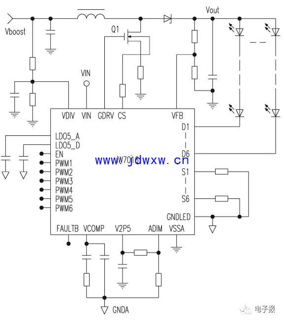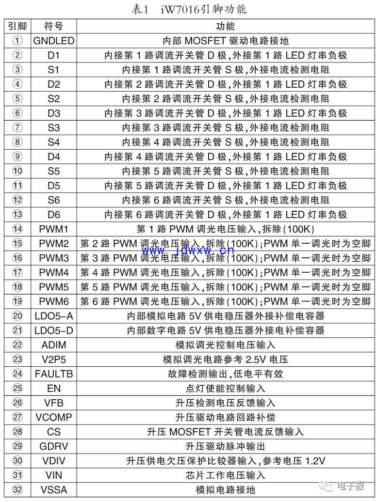 iW7016是美国加利福尼亚州坎贝尔iWatt (爱瓦特)公司推出的六通道LED背光驱动电路,内置一个升压驱动电路和六路LED调流驱动电路及其MOSFET开关管,提高LED背光灯串的供电,并对LED背光灯串电流进行调整和控制。iW7016提供高热补偿性能,弥补了正向电压不匹配,使用对话功能专有数字电源管理和专利BroadLEDTM自适应切换模式电流调节技术。iW7016有多个功能保护电路,采用逐周期检测,以确保系统的可靠性,并提供一致的操作,被广泛应用在国产和进口LED液晶彩电中。 iW7016具有以下特点: 1、工作电压范围9V到36V。 2、支持6通道LED背光灯驱动,每通道最高输出电压85V。 3、采用专利BroadLEDTM自适应切换模式,实现最大效率高电流匹配,匹配精度达±2%。 4、2D模式每通道平均电流300mA,3D模式每通道平均电流600 mA,PWM控制上升到25%。 5、内部集成直流-直流升压驱动控制电路,输出10V的MOSFET门驱动电压,可编程开关频率从100kHz到208kHz,内设软启动电路,限制浪涌电流。 6、支持两种直接PWM调光模式:仪式多个直接PWM输入和多个PWM输出;二是单一直接与相移PWM输入,多个PWM输出,低EMI和低输出纹波。 7、支持PWM尾巴转变模式。 8、全面的保护功能:一是LED开路故障检测;二是LED短路故障检测;三是过热关机;四是升压驱动过流、过压和欠压保护;四是升压供电欠压保护。 9、采用SOP32封装形式。 iW7016的应用电路图见图1所示 引脚功能见表1所示。