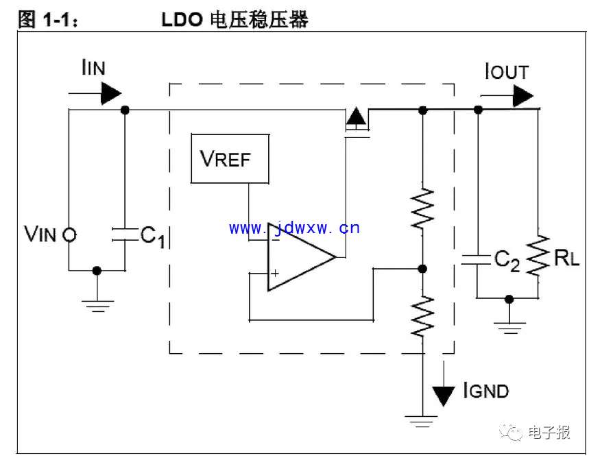 标准三端线性稳压器的压差通常是 2.0-3.0V。要把 5V 可靠地转换为 3.3V,就不能使用它们。压差为几百个毫伏的低压降 (Low Dropout, LDO)稳压器,是此类应用的理想选择。图 1-1 是基本LDO 系统的框图,标注了相应的电流。从图中可以看出, LDO 由四个主要部分组成: 1. 导通晶体管 2. 带隙参考源 3. 运算放大器 4. 反馈电阻分压器 在选择 LDO 时,重要的是要知道如何区分各种LDO。器件的静态电流、封装大小和型号是重要的器件参数。根据具体应用来确定各种参数,将会得到最优的设计。 LDO的静态电流IQ是器件空载工作时器件的接地电流 IGND。 IGND 是 LDO 用来进行稳压的电流。当IOUT>>IQ 时, LDO 的效率可用输出电压除以输入电压来近似地得到。然而,轻载时,必须将 IQ 计入效率计算中。具有较低 IQ 的 LDO 其轻载效率较高。轻载效率的提高对于 LDO 性能有负面影响。静态电流较高的 LDO 对于线路和负载的突然变化有更快的响应。 技巧二:采用齐纳二极管的低成本供电系统 这里详细说明了一个采用齐纳二极管的低成本稳压器方案。