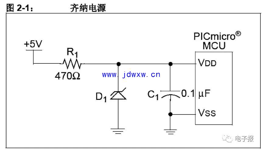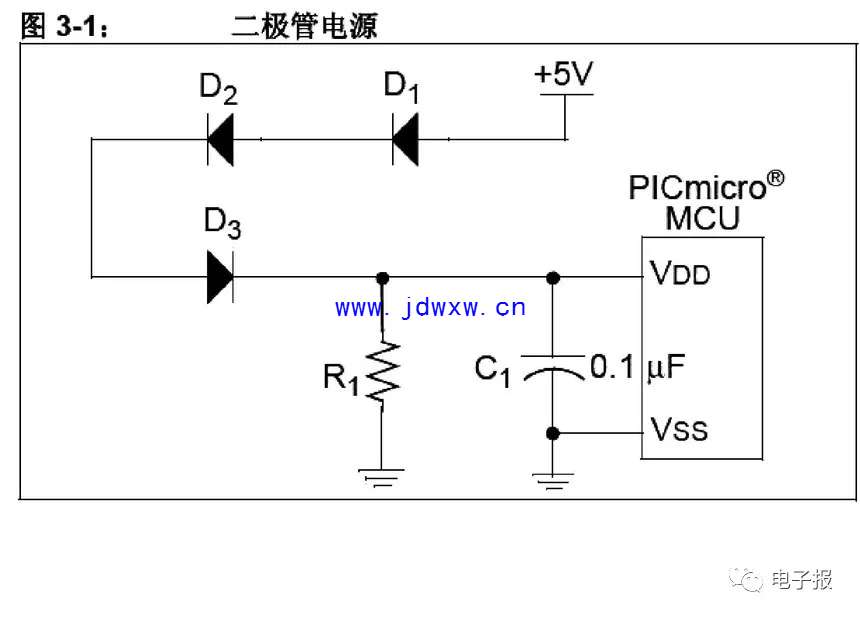 可以用齐纳二极管和电阻做成简单的低成本 3.3V稳压器,如图 2-1 所示。在很多应用中,该电路可以替代 LDO 稳压器并具成本效益。但是,这种稳压器对负载敏感的程度要高于 LDO 稳压器。另外,它的能效较低,因为 R1 和 D1 始终有功耗。R1 限制流入D1 和 PICmicro? MCU的电流,从而使VDD 保持在允许范围内。由于流经齐纳二极管的电流变化时,二极管的反向电压也将发生改变,所以需要仔细考虑 R1 的值。 R1 的选择依据是:在最大负载时——通常是在PICmicro MCU 运行且驱动其输出为高电平时——R1上的电压降要足够低从而使PICmicro MCU有足以维持工作所需的电压。同时,在最小负载时——通常是 PICmicro MCU 复位时——VDD 不超过齐纳二极管的额定功率,也不超过 PICmicro MCU的最大 VDD。 技巧三:采用3个整流二极管的更低成本供电系统