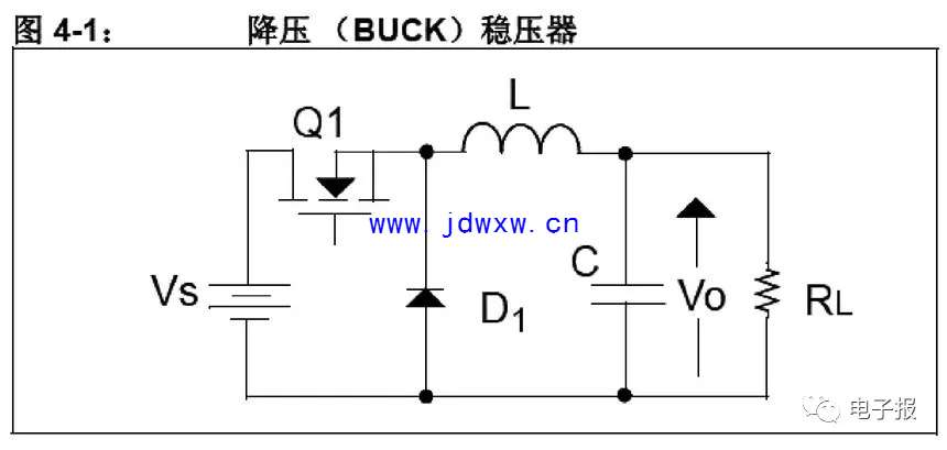 如图 4-1 所示,降压开关稳压器是一种基于电感的转换器,用来把输入电压源降低至幅值较低的输出电压。输出稳压是通过控制 MOSFET Q1 的导通(ON)时间来实现的。由于 MOSFET 要么处于低阻状态,要么处于高阻状态(分别为 ON 和OFF),因此高输入源电压能够高效率地转换成较低的输出电压。 当 Q1 在这两种状态期间时,通过平衡电感的电压- 时间,可以建立输入和输出电压之间的关系。