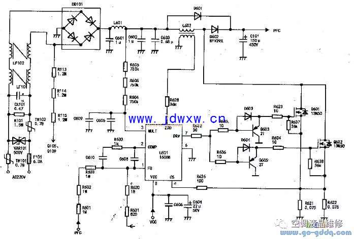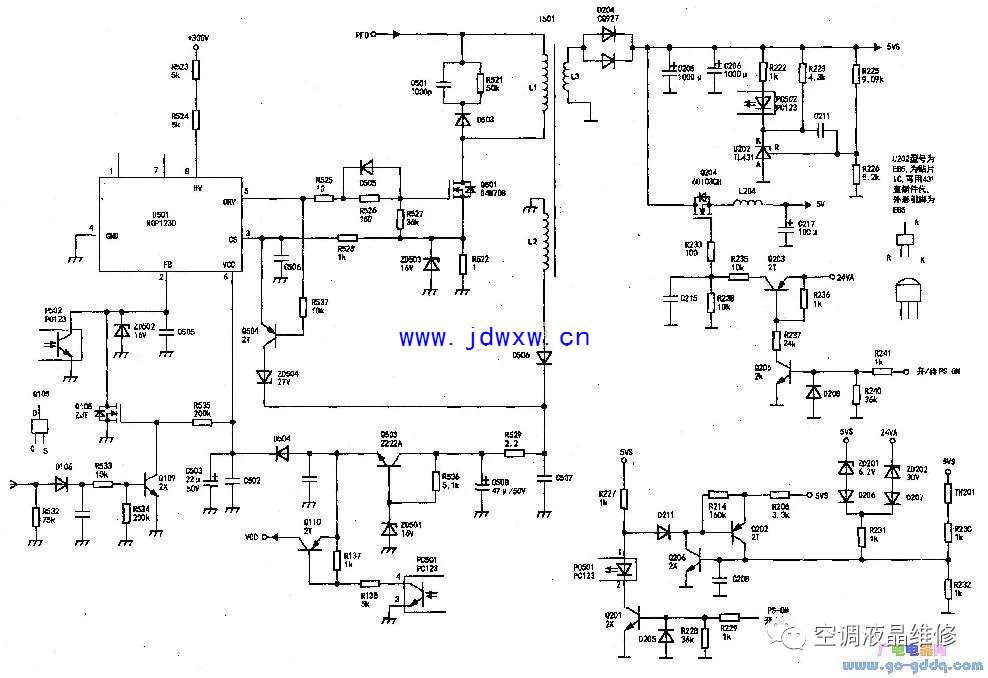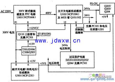 长虹液晶彩电FSP306-4F01电源板市电输入及整流电路 电路图如下图所示,220V交流市电,经CX101、LF101、LF102为核心的滤波电路,再经BD101桥式整流,在C602两端产生约300V直流脉动电压。 长虹液晶彩电FSP306-4F01电源板PFC电路电路如下图所示,U601为驱动芯片,Q601、Q602为功率输出管,L602为储能电感,D602为续流二极管、C101为滤波电容。待机时,U601(1606B)的⑧脚VCC近似0V,故PFC不起振,此时PFC的作用只是把300V脉动电压进行滤波,故PFC端输出300V直流电压,供副电源用。 长虹液晶彩电FSP306-4F01电源板副电源电路电路如下图所示,驱动块U501型号为NCP1230,引脚功能:①脚空,②脚为稳压反馈输入端,③脚为电流检测端,④脚为地,⑤脚为激励脉冲输出端,⑥脚为供电,⑦脚空,⑧脚为高压输入端。功率输出场效应管为Q501(04N70B)。 长虹液晶彩电FSP306-4F01电源板开/待机控制电路该电路分为两路:一路以Q205、Q203为核心.控制5V,上边已经介绍了;一路以Q201、PC501为核心控制PFC电路、主电源电路是否起振。开机状态时,控制信号为高电平,Q201饱和导通,开/待机光祸PC501导通,使热端Q110导通,VCC为11V左右,PFC驱动块1606B的⑧脚、主电源驱动块NCP1396AG的12脚得到工作电压而起振。待机时,控制信号为0V、Q201、PC501、Q110均截止,VCC近似OV、PFC电路、主电源电路停振。 长虹液晶彩电FSP306-4F01电源板保护电路电路如下图所示,此电源板有三个保护电路:第一路24VA的整流二极管D203过热保护。热敏电阻TH201被胶粘在24VA整流管的散热片上,正常时对5VS分压小,对于以Q206、Q202组成的模拟可控硅无影响,当24VA整流管散热片温度高到一定程度,使TH201阻值下降到一定程度,使8232分得电压降达0.6V时,模拟可控硅导通;第二路5VS过压保护。当5VS正常时对模拟可控硅无影响,当5VS端子电压超过6.2V时,ZD201导通,使模拟可控硅导通;第三路24VA过压保护。24VA端子电压正常时对模拟可控硅无影响,当24VA端子电压超过30V时ZD202导通,使模拟可控硅导通。上述三个保护只要有一个启动,则模拟可控硅导通,通过D211把待机光祸PC501的①脚电压拉低到0.7V,故待机光祸PC501截止,使热端VCC为约0V、PFC、主电源电路停振。 虹液晶彩电FSP306-4F01开关电源板适用机型及特点FSP306-4F01是永胜宏FSP系列中适用于82~106cm(32~42英寸)液晶电视的开关电源,其适用机型包括:长虹LTDV32876、LT37710、LDTV40876F、LT429OOFHD、LDTV42866U、LDTV42700FHD、LDTV42876F、LDTV42810FU等。 |