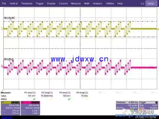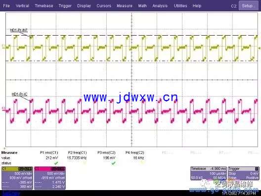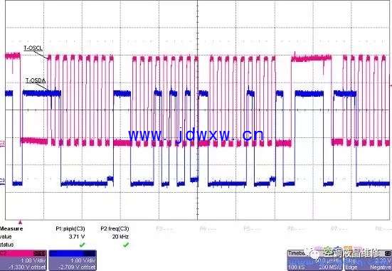 5、高频头U28的I?C总线时钟信号SCL和数据信号SDA,即U28的第3、4脚处波形如下图所示: