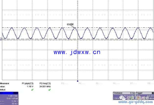 6、晶体震荡器YM1产生24MHZ正弦波。不准确的震荡频率会导致不能正常进行信号解调,产生图象失色等现象,波形如下图所示: