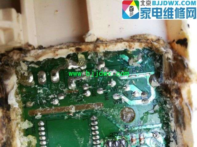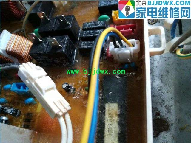 找到门锁在主控板上的插座,门锁到这个插座有三根线,黑(控制锁门),黄(L),蓝(关门信号)。测量黄蓝线,均有电压,看来是主控板上检测电路有问题了。加热电烙铁,再次在门锁插座处烫开一个口子,找到相关电路。
