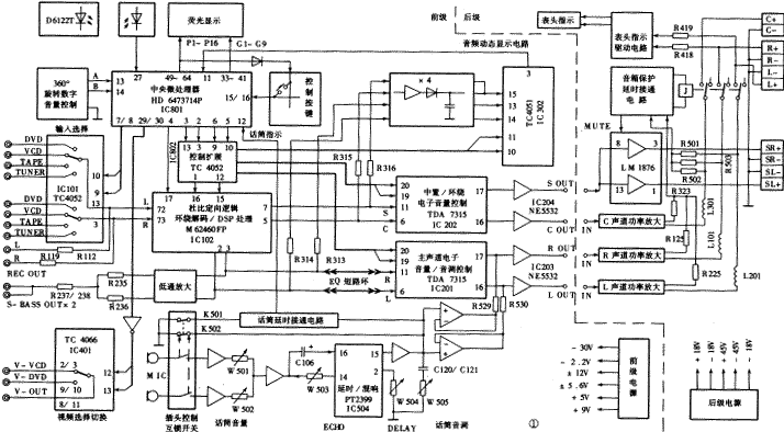 奇声AV-747DB是奇声公司最新推出的家庭影院AV中心,采用前后级分体式结构。其前级以HD6473714P微处理器作控制中心,以超大规模集成电路M62460FP为杜比定向逻辑环绕声解码(PRO.LOGIC)和数字环绕声场效果(DSP)处理的核心,用TDA7315控制主声道(L、R)、中置声道(C)、环绕声道(S)的音量、音调调节。该机除卡拉OK系统以外的所有功能实现了全数字化控制和遥控控制。由于采用了荧光显示屏作操作指示,人机对话功能大大增强,使操作变得非常简单明了。后级对L、R、C、S各声道进行独立的功率放大,输出功率强劲。其输出保护电路具有开机静噪、过流保护、过压保护和输出短路保护等功能。该机的卡拉OK电路采用了PT2399回响集成电路,对人声的表现较为出色,并分别设计了话筒音量、音调和混响深度、延迟时间等控制电路,使用者可以根据自己的喜好进行调节。其前/后级电源电路中几乎每个绕组都安装了保险管,保证了整机安全。该机还附设了超重低音线路输出和两路视频选择切换功能,使用起来十分方便。其原理方框图如图1所示。