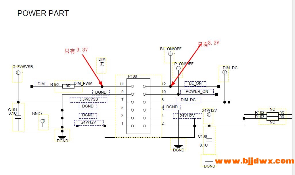TCL L32P21BD液晶电视(MS81S机芯)经检查只有背光不亮,就是P100   11   12脚电压只有3.3V不知正常否?还请高手分析。