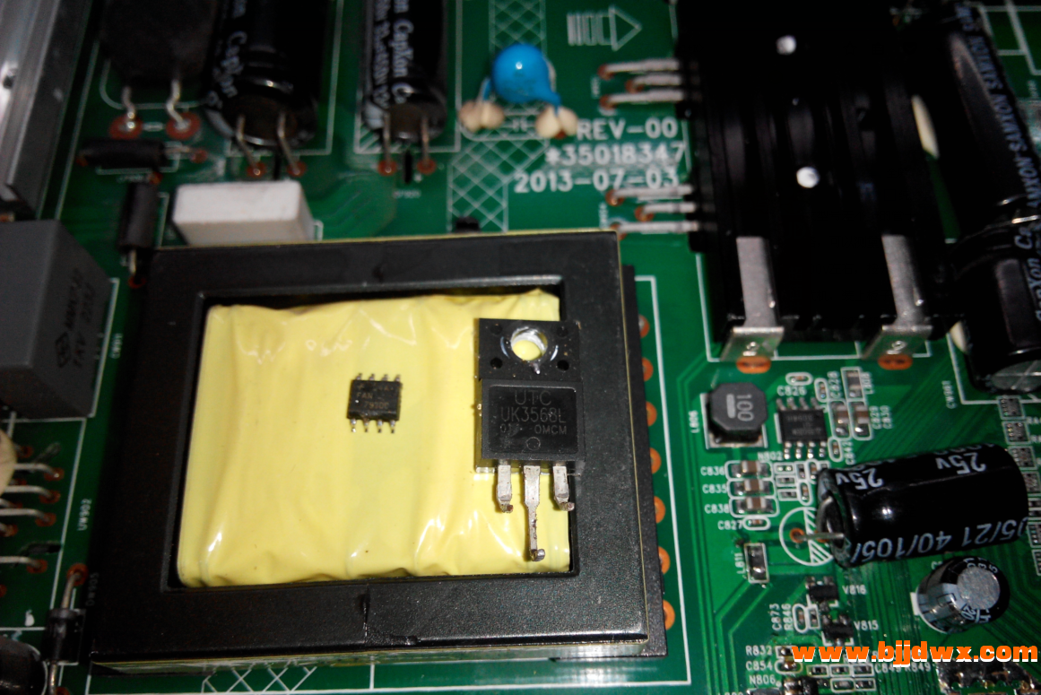 首先测量保险管已烧断,凭着检修经验测量散热片下场管已击穿,拆下管子后再测量外围元件发现没问题,于是就在旧板子上找型号差不多的管子代换,功夫不负有心人很快找到个代换管子,拆下原机保险,暂不装保险焊上试机灯泡,通电试机灯泡微亮下就灭,证明后级没短路,可以测量电压了,初步测量待机电压正常5.1v左右稳定,去掉灯泡喊上保险装机试机,通电指示灯还是不亮,测量还是只有待机电压,PFC电压300v左右,按开机键无反应,又拆下板子检查,先检查高电压下的降压电阻,逐个焊掉涂有红胶的大电阻,测量没发现问题,除掉红胶后重新焊上电阻试机,装上板子后测量还是只有待机电压,在通电下测量几个关键点电压,发现都没电压,正测量电压时发现红色指示灯亮起来了,按下开机键电视开机了,图声都正常,拔下电源又反复开机都正常,以为修好了就合盖试机了,试机一下午都正常,第二天再开机发现开不开了,插上电源没关它过了几分钟红色指示灯亮了,只要指示灯亮起按下二次开机键就可以开机了,然后又拔下电源,再通电电视又不开机了,重新开盖检查,怀疑是5v滤波电容不良,代换电容后故障不变,只有待机电压红灯不亮,证明问题还在PFC电路,于是又回来检查场管附近电路,既然场管坏了应该还有元件烧毁,于是就顺线路检查发现有个10欧姆贴片电阻烧坏,