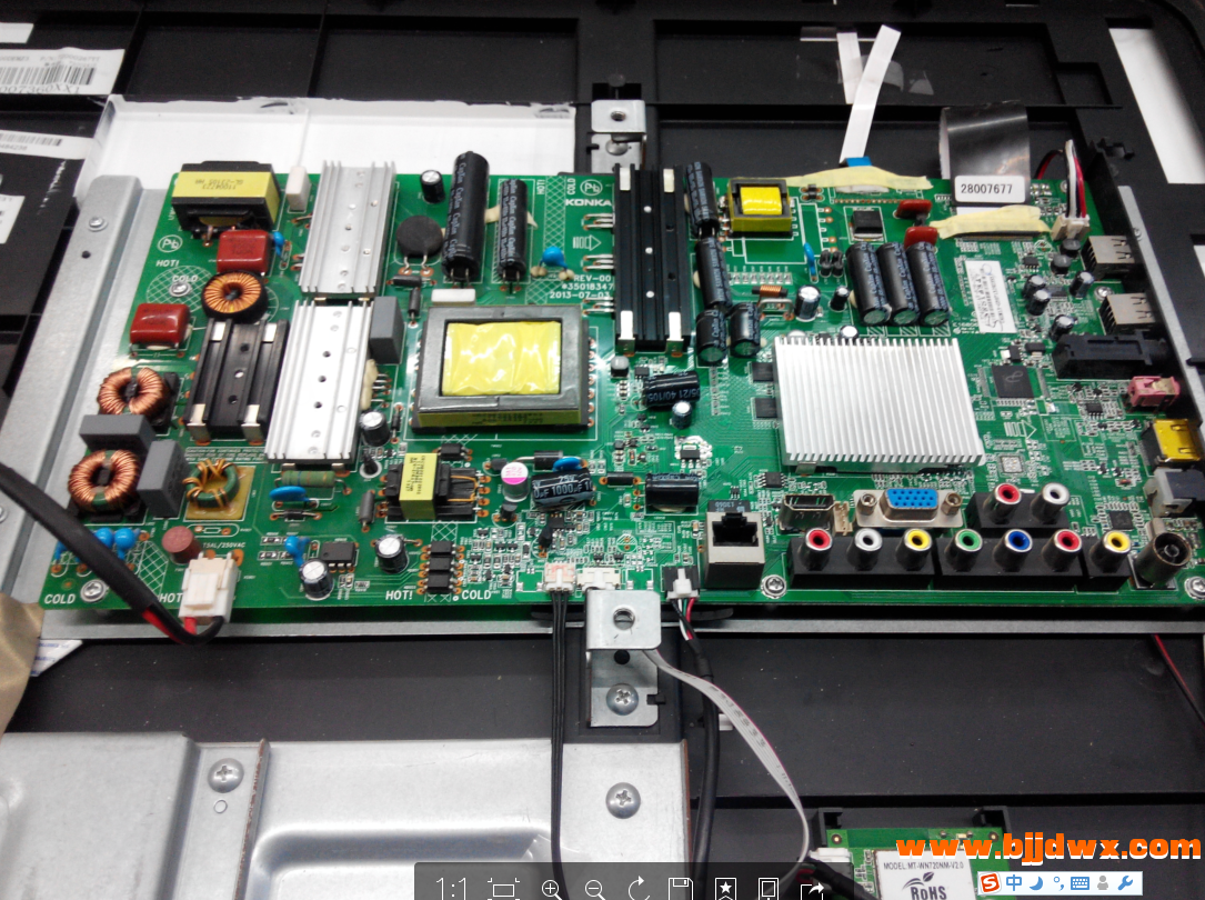 接修一台康佳46寸电视不通电,开盖检查发现该机是一体大板网络电视,指示灯不亮,问题应该是电源部分,用表测量大电解电容无电压,为防止拆装板子大电容放电,用试机灯泡给电容彻底放电,然后开始拆卸大板,去掉各连接线摘板检查。